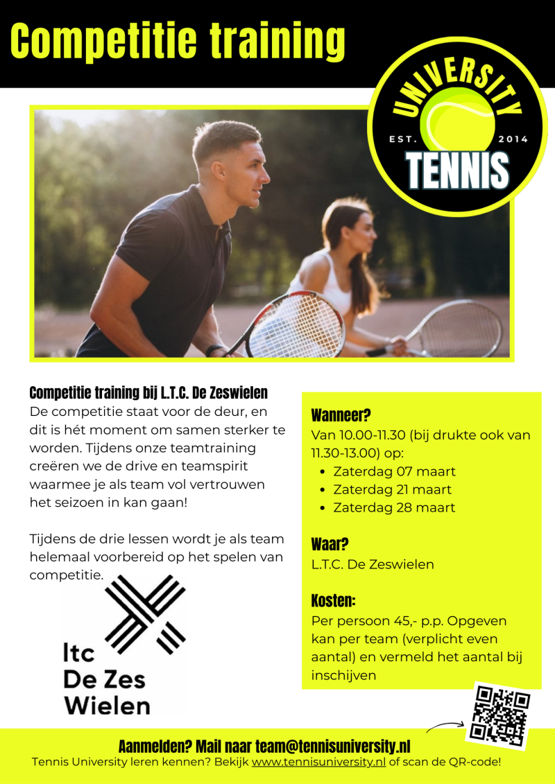 - Voor deelname aan de training moet je lid zijn van L.T.C. De Zeswielen voor aanvang van de 1ste training. Lid worden kan via www.zeswielen.nl.